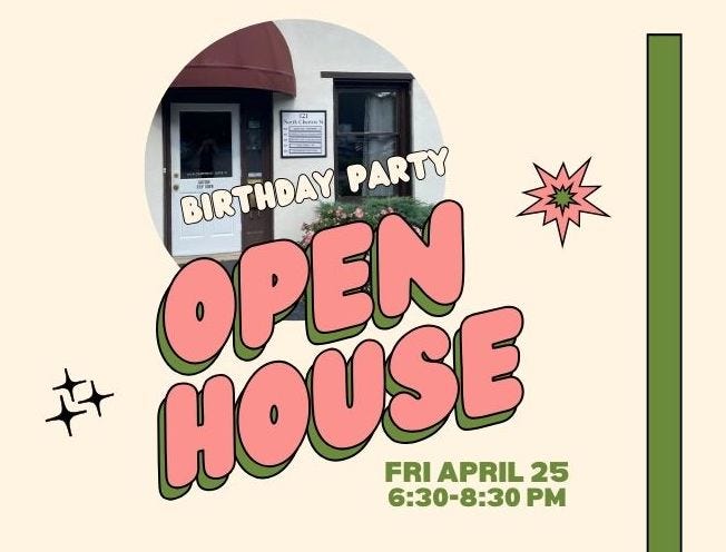 During Last Friday on April 25, we’re hosting a birthday party / open house at 121 N Churton St. in Hillsborough where I share office space with a lovely group of massage therapists, energy workers, and other healing arts providers. Swing by to see the space, meet the practitioners, check out local art on display, and enjoy some cake, mocktails, and other treats. You’ll find us under the red awning around the back side of the Mercantile Center facing the parking lot.