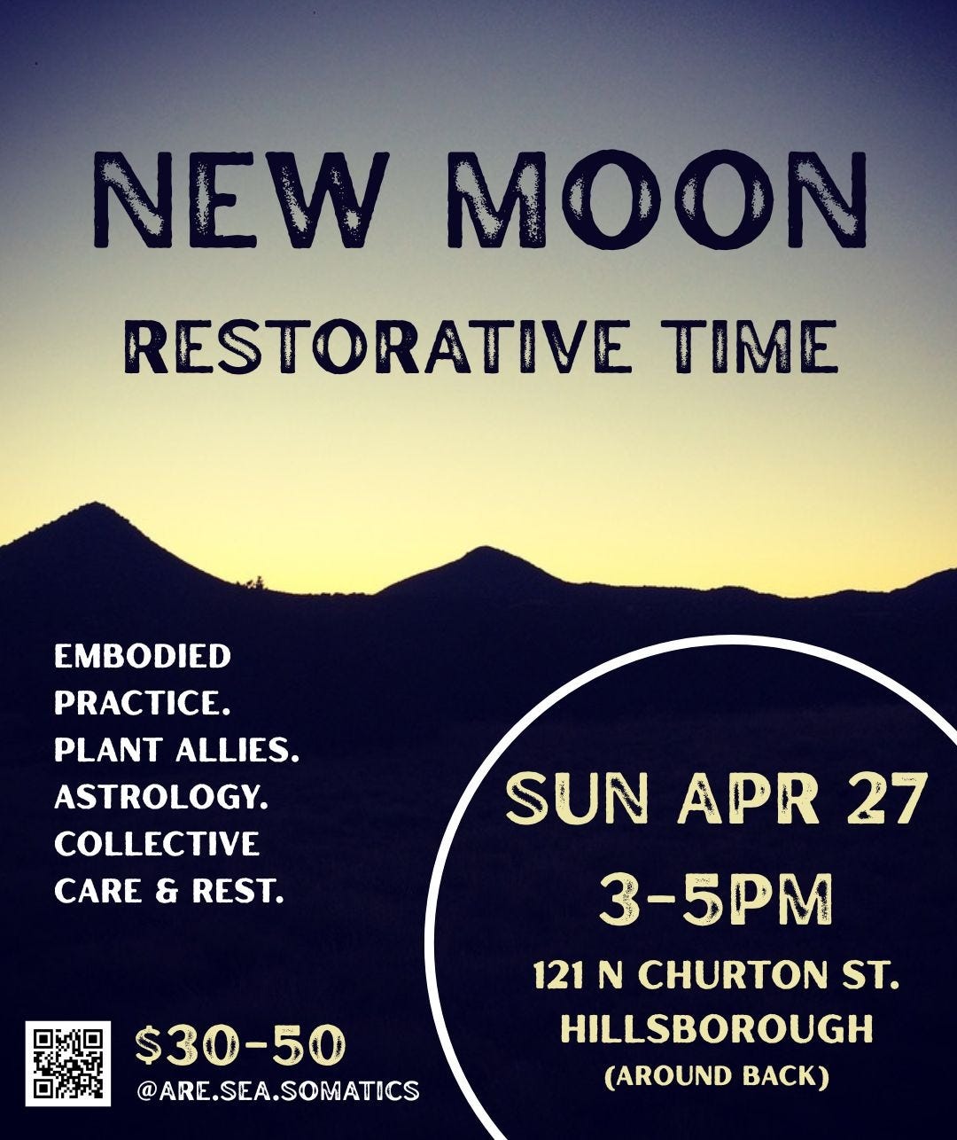The sun is about to shift into slow-moving & sensuality-slurping Taurus, so right on schedule I’m inviting you to 1) come *EaT CaKe* at our healing arts open house in Hillsborough and then 2) join me for some collective rest & embodied practice in honor of the new moon. If anyone else needs to crash-land into the end of this wild month, I’m right here with and for you. Details for both the restorative class and the open house are below, along with some shout-outs about other local offerings.